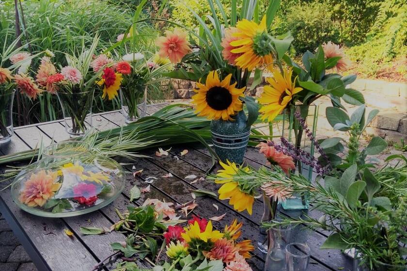 Ein Projekt war unter anderem, das Gestalten neuer Namensschilder für die Tische. Mit viel Freude wurden kleinste Blumen, Blätter und Kräuter gesammelt, mittels einer Blumenpresse getrocknet und anschließend durch die Gäste individuell für sich gestaltet.