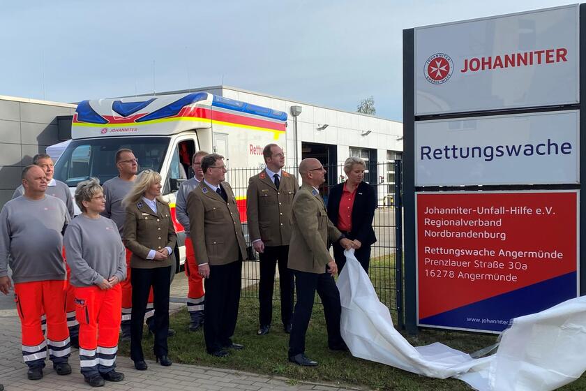 Nachdem der Angermünder Pfarrer Jonathan Schmidt den Rettungskräften Gottes Segen für ihre Arbeit aussprach, hieß auch Landesvorstand David Kreuziger die neuen Mitarbeitenden willkommen. „Wir freuen uns über ein neues Team aus engagierten Retterinnen und Rettern, die mit Vertrauen zu den Johannitern gewechselt sind.“ Auch Dietrich von Buch begrüßte die Rettungskräfte sehr herzlich: "Willkommen in der Johanniter-Familie. Wir sind überaus glücklich mit Ihnen hier in der Uckermark in den Einsatz gehen zu dürfen." Der ehrenamtliche Regionalvorstand sicherte zu, dass er als Angermünder bei allen Sorgen und Wünschen gern als Ansprechperson zur Verfügung steht. Noch während der Grußworte ging der erste Notruf ein. Der hochmoderne neue Rettungstransportwagen rückte aus – zum ersten Notfalleinsatz der Johanniter in der Uckermark.