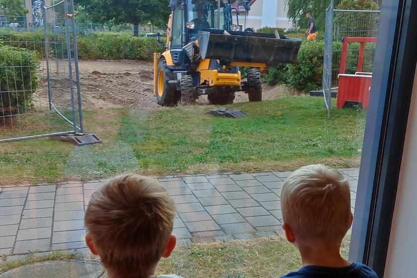 Ganz gespannt holten sich neugierige Kinder Stühle heran, um den Beginn des Umbaus unserer Außenanlage zu beobachten.