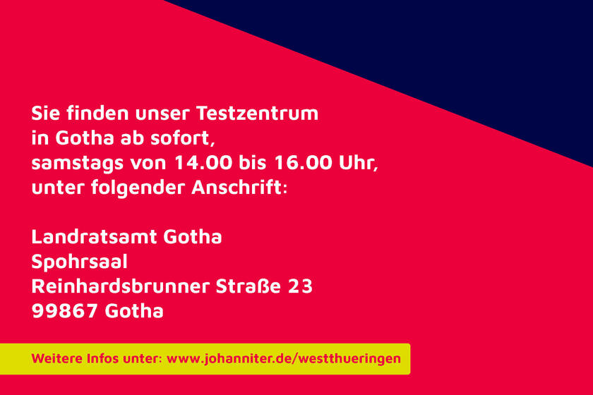Ab sofort finden Sie unser Testzentrum in Gotha immer samstags von 14.00 Uhr bis 16.00 Uhr unter folgender Anschrift: