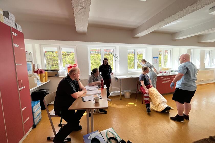 Am Mittwoch, den 10.05.2023 unterstützten die Johanniter aus dem Regionalverband Brandenburg-Nordwest die Medizinische Schule des Universitätsklinikums Brandenburg an der Havel bei der Zwischenprüfung ihrer Schüler und Schülerinnen des 2. Lehrjahres zur Pflegefachkraft. Insgesamt 54 zukünftige Pflegefachfrauen und Pflegefachmänner mussten je ein Fallbeispiel im Rahmen ihrer praktischen Zwischenprüfung im Bereich Erste Hilfe / Notfallversorgung bewältigen. „Die Auszubildenden sollten beispielsweise einen Asthmaanfall, Über- und Unterzuckerung oder Verschlucken erkennen und passende Hilfsmaßnahmen einleiten“, erklärt Lemke. Das Johanniter-Team, bestehend aus vier Verletztendarstellerinnen und einem Prüfer mit fachlichem Hintergrund, haben gemeinsam mit den Lehrkräften der Medizinischen Schule den Tag gestaltet. Wer Lust hat, die Facetten des Ehrenamtes der Johanniter-Unfall-Hilfe kennenzulernen darf sich gerne unter der E-Mail Adresse (rv.brbnw(at)johanniter.de) bei Ines Lemke melden.