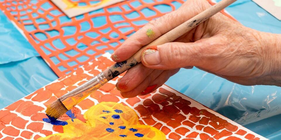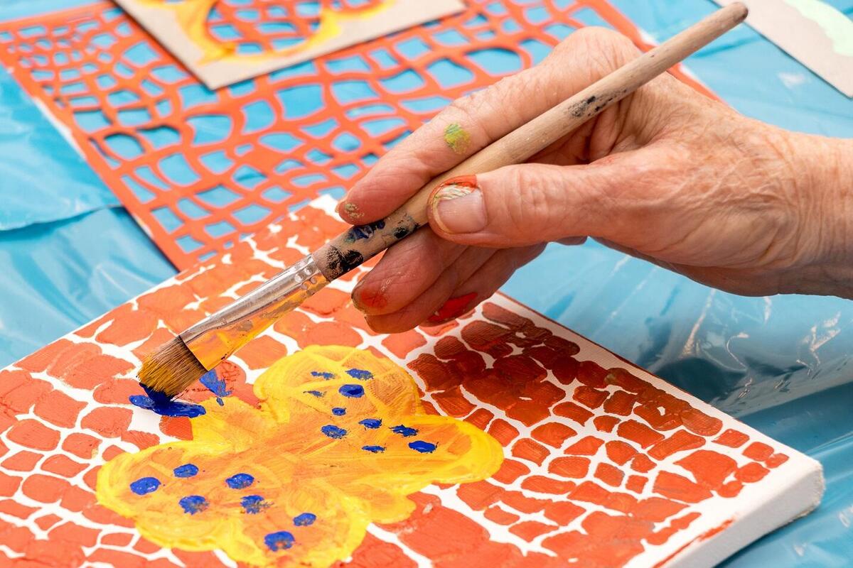Die jährlichen Malaktivitäten der Seniorinnen und Senioren im Johanniter-Haus Waibstadt mit der zugehörigen Vernissage spielen sich mittlerweile in einem rituellen Rahmen ab und behalten doch auch in der 11. Folge ihr sehr besonderes Flair. In drei Sitzungen waren 28 künstlerisch ansprechende Arbeiten entstanden, und obwohl die 23 Teilnehmerinnen und Teilnehmer dieselben Malutensilien zur Verfügung hatten, wirkten die Ergebnisse individuell und ausdrucksstark. Heidrun Fischer-Hamann als maltherapeutische Begleiterin hatte im zweiten Kunst-Workshop unter ihrer Leitung mit vielen unterschiedlichen Schablonen die Lust am Experimentieren geweckt. Schablonen wurden als Positiv- und Negativdruck eingesetzt, wirkten eher als Hintergrund für weitere Übermalungen mit dem Pinsel, füllten als Gestaltungselement eine komplette Leinwand oder traten in interessante Beziehung zueinander. Die Form der Schablonen beeinflusste deren individuelle Interpretation, die Farbenwahl und die fantasievollen Titel der „KunstArt 2022“. So entstanden farbintensive Arbeiten einerseits in leuchtenden Blautönen, die Wasserwelten vermittelten und daneben Ergebnisse in sommerlichen Rotgelbgrüntönen, die wie sonnige Gärten anmuteten.