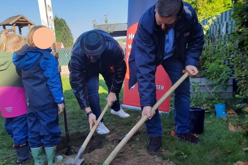 Drei Bäume waren Geschenke: der Kita-Fachbereichsleitung der Johanniter-Landesgeschäftsstelle und der Stadt Werther, so dass es sich der Bürgermeister nicht nehmen ließ, heute selbst mit dem Spaten anzupacken.