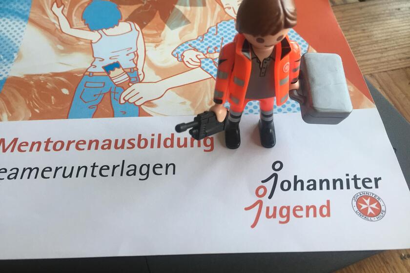Ein Arbeitsauftrag für die angehenden Mentor*innen aus ganz Deutschland in der digitalen Schulung war, sich drei Gegenstände die seine*ihre Werte für die zukünftige Arbeit widerspiegeln zu Hause zusammensuchen. Ein Teilnehmer zeigt dazu die Playmobilfigur der Johanniter und benannte die drei Teile wie folgt: Das Männchen steht für Begleitung. Der Koffer stellt den Wert Zeit nehmen dar. Das Funkgerät steht für Kommunikation.