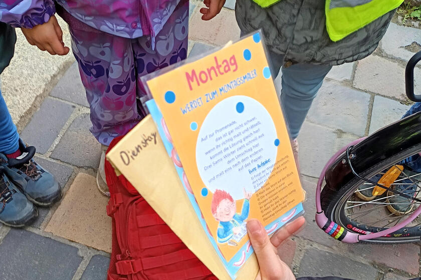 Zuerst ging es in die Herzog-Max-Straße: In einem Lastenrad lag ein Rucksack mit mehreren Vorhängeschlössern bereit. Auf der anschließenden Stadtrallye durch die Altstadt musste an den verschiedenen Stationen Rätsel für Rätsel gelöst werden, um jeweils den Code für das nächste Schloss zu erhalten. So mussten die Vorschulkinder z.B. Montagsmaler mit Sams-Wörtern spielen, die Stufen am Rathaus am ZOB zählen und am alten Rathaus die Buchstaben einer Inschrift zählen.