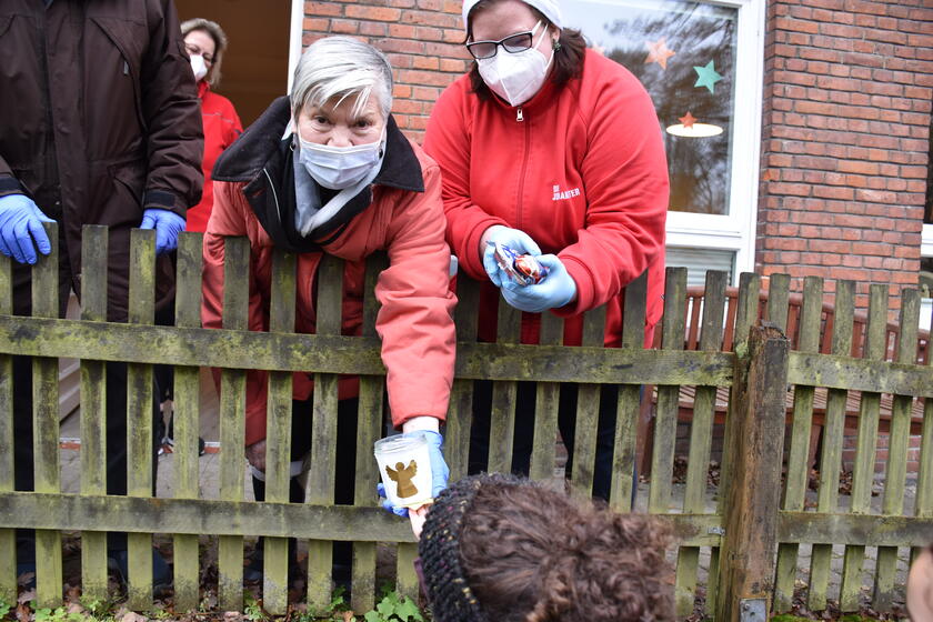 Martina Riedel, Lehrerin einer Vorschulklasse an der Grundschule Marmstorf, hatte die Idee, mit ihren Schülerinnen und Schülern Schutzengellichter zu basteln und diese den Tagesgästen im Haus am Feuerteich zu schenken. Liebevoll hatten die Kinder ihre Teelichter mit goldenen Engeln beklebt. Die Vorschüler machten nun einen kleinen Ausflug in den Garten der Johanniter-Tagespflege. Zur Freude der Seniorinnen und Senioren sangen sie „Schneeflöckchen, Weißröckchen“. Am Gartenzaun überreichten die Mädchen und Jungen ihre Kunstwerke dann den Tagesgästen. Neben dem Teelicht übergab jedes Kind auch einen Glücksstern mit ganz persönlichen Wünschen an den jeweiligen Tagesgast. Sonja Eikhof, Leiterin der Tagespflege Marmstorf, war von der Aktion der Vorschulkinder begeistert: "Unsere Tagesgäste haben sich sehr über die Aufmerksamkeit gefreut. Die selbst gebastelten Lichter werden noch lange Thema bei unseren Seniorinnen und Senioren sein, weil sie so viel Herzenswärme ausstrahlen." Als Dankeschön gab es für jeden kleinen Künstler einen Weihnachtsmann aus Schokolade.