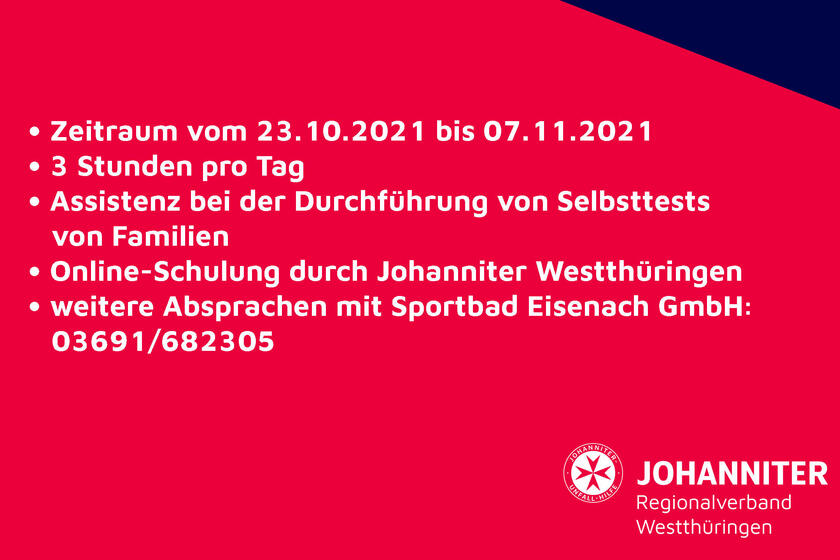 Vom 23.10. bis zum 07.11.2021 sucht das Sportbad Eisenach GmbH Unterstützung für die Durchführung bei den Schnelltests von Kindern und Familie.