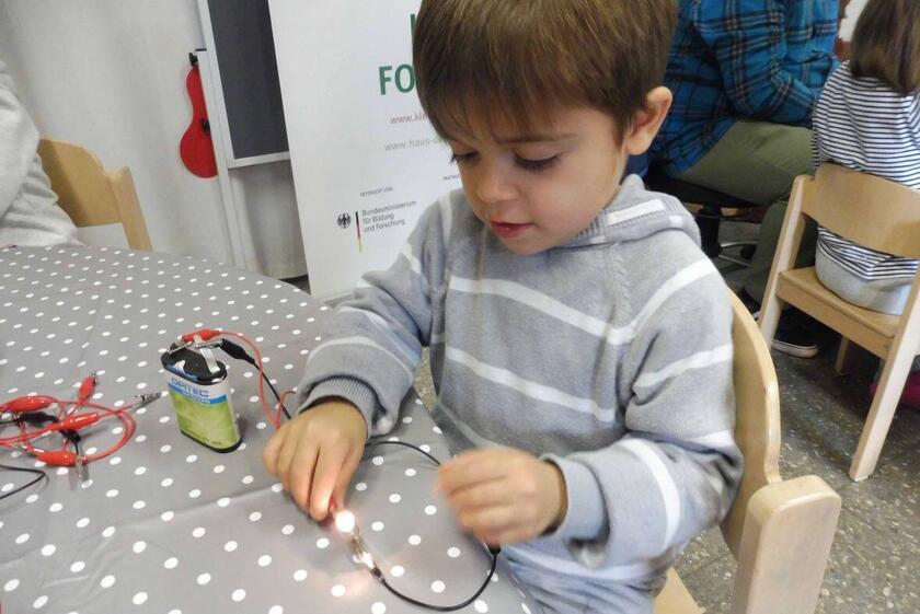 Magnetismus und Energie konnten im Forschermobil erkundet werden. Mit einer Batterie, einer Glühbirne und ein paar Kabeln bauten die Kinder einen eigenen Stromkreis, aus einer Wäscheklammer und etwas Alufolie einen eigenen Schalter. Sie untersuchten, welche Dinge magnetisch sind und machten Magnetfelder mittels Eisenspänen sichtbar.