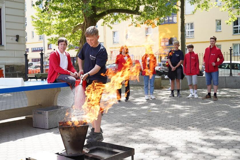 Profis beobachten die jungen Rettenden beim Helfen, werten aus und geben Hinweise. Die NachwuchssanitäterInnen üben zudem das Tragen von Verletzten, es gibt einen Theorietest und Workshops. Brandbekämpfung steht ebenfalls auf dem Lehrplan. Dafür ist die Feuerwehr Mölkau mit Einsatzfahrzeugen und Equipment angereist.