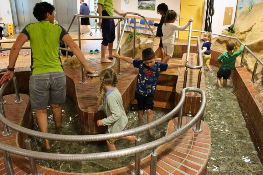 Ein ganz besonderes Erlebnis war der Besuch der Rehaklinik in Ichenhausen. Schon bei der Ankunft wurden die kleinen Weltentdecker vom Klinikteam herzlich in Empfang genommen. Dort hatten die Kinder die Möglichkeit, das Wassertreten im eigens für sie angepassten Kneippbecken zu testen. Mutig wurden die nackten Füße ins kalte Wasser getaucht – ein ungewohntes, aber spannendes Gefühl! Auch Kneipp-Güsse mit warmem und kaltem Wasser durften selbst ausprobiert werden. An Duftstationen konnten verschiedene Kräuter und Pflanzen erschnuppert werden, was die Sinne anregte und das Gespür für die Natur schärfte.
