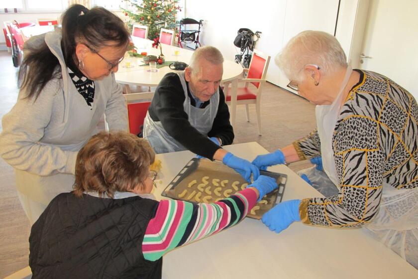 Fest im Griff hat es Mitarbeiterin Moni Schmidt, die einen straffen Plan beim Plätzchenbacken verfolgt – schließlich wollen acht verschiedene Varianten in der hauseigenen „Weihnachtsbäckerei“ gemeinsam gezaubert und aus dem Ofen geholt werden: Von Vanillekipferl über Spritzgebäck, Haferflockenplätzchen, Buttergebäck, Kokosmakronen, Schneeflocken, Kulleraugen bis hin zu Nussplätzchen bleibt dieses Jahr kein Wunsch offen. „Die Gäste haben fleißig mitgebacken und alte Erinnerungen ausgetauscht. Es war jedes Mal eine besondere Stimmung in unserer Weihnachtsbäckerei, in der viele Tipps und Tricks ausgetauscht wurden. Die Tagespflegegäste können in der Regel zuhause nicht mehr alleine Plätzchen backen und haben unser Angebot des gemeinsamen Werkelns mit Freude angenommen“, erzählt Christina Herwig, Leiterin der Tagespflege.
