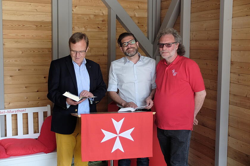 Ebenfalls am Wochenende wurde der BIBEL-MARATHON als Teilprojekt der Weltausstellung, Torraum 5, gestartet. Samstag und Sonntag wurde bereits fleißig durch die Johanniter und Weltausstellungsbesucher die Bibel gelesen. Den Rahmen gibt ein kleiner überdachter Raum im Freien des Johanniter-Gartens mit Lesebank, Lesepult, Stühlen zum Hören und Ausruhen sowie Bibeln in verschiedenen Sprachen. Besonders haben sich Dr. Nikolaus Würtz, Regierender Kommendator der Brandenburgischen Provinzial-Genossenschaften des Johanniterordens, und Stefan A. Beck, Beauftragter für Marketing und Öffentlichkeitsarbeit des Johanniterordens, gefreut, als am Sonntag Ulrich Schneider, Geschäftsführer des Reformationsjubiläum 2017 e. V., gemeinsam mit seinem Pressechef Christof Vetter, beim BIBEL-MARATHON einen Eröffnungsbesuch abstattete und dem Projekt und damit den Johannitern gutes Gelingen und viele mitlesende Besucher wünschten.