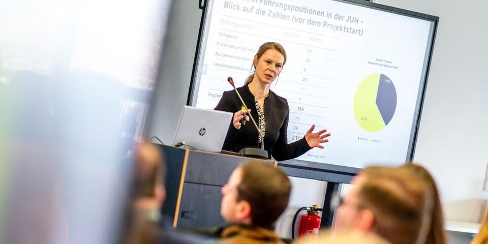 Um Vielfalt ging es auch im Vortrag von Christiane Ziervogel, Stabsbereichsleitung Stabsbereich Strategie, Organisationsentwicklung & Projektsteuerung in der Bundesgeschäftsstelle – um Vielfalt in der Führung nämlich. Rund 62 Prozent der Mitarbeitenden in der Johanniter-Unfall-Hilfe sind Frauen. Damit sich diese Mehrheit perspektivisch auch mehr in den Führungsetagen widerspiegelt, wurde das Projekt "Frauen in Führung" initiiert, das unter anderem bisherige Hemmnisse und künftige Brücken identifizieren soll. Mehr Frauen in Führungspositionen zu bringen, stärke nicht nur die geschlechtliche Vielfalt in den Führungsetagen, sondern habe nachweislich auch Effekte auf die Wirtschaftlichkeit und Nachhaltigkeit einer Organisation, was die Johanniter-Unfall-Hilfe für die Zukunft stärken könne, so Ziervogel.
