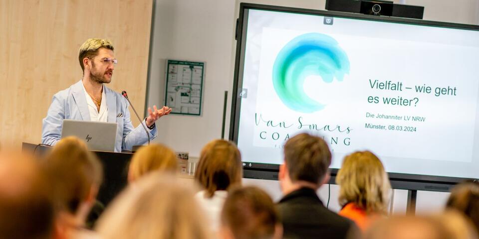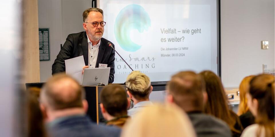 Florian Smarsly, selbstständiger Coach mit mehr als 13 Jahren Erfahrung als Johanniter, legte in seinem Vortrag den Fokus auf das Kennenlernen der Dimensionen und Merkmale von Vielfalt, die weit über die allseits bekannten "Gendersternchen" und "Regenbogenflaggen" hinaus reichen. Um der Vielfalt von Vielfalt näher zu kommen, wurden die Teilnehmenden gebeten, ihre eigenen Vielfaltsmerkmale zu benennen und sich zu fragen, welche Erfahrungen sie mit verschiedenen Aspekten von Vielfalt und den sie tragenden Menschengruppen im Laufe ihres Lebens gesammelt haben. Diese aktive Auseinandersetzung mit der eigenen Biographie untermauerte Smarsly mit einem Aufruf an die Teilnehmenden, Vielfalt aktiv zu gestalten: "Vielfalt fängt stets bei einem selbst an."