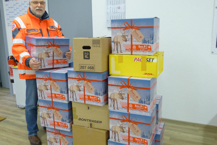 Ebenfalls eine dreistellige Anzahl vermeldet der Ortsverband Edewecht mit seinen Sammelstellen, dem Ammerländer Kamin- und Ofenstudio AKOS von Ralf Gauger, der ESSO Station Bruns in Rastede sowie ESSO und Autohaus Bruns in Wiefelstede. Zudem wurden drei Pakete bei Daniela Bruns zuhause abgegeben, so dass insgesamt 105 Pakete zusammen kamen. Besonders aktiv war auch der Ortsverband Hude, dessen ehrenamtliche Helferschaft eigens verlängerte Öffnungszeiten in der Dienststelle zur Annahme der Pakete angeboten hatte. Hier konnten die Bürgerinnen und Bürger die Paketinhalte auch lose anliefern. „Wir haben dann alles zusammengepackt in vorbereitete Kartons mit weihnachtlichen Motiven“, sagt Ortsbeauftragter Andreas Feige. 23 vollständig gepackte Kartons kamen so zusammen, deutlich mehr als im vergangenen Jahr. „Dafür möchten wir uns bei allen Spenderinnen und Spendern aus Hude ganz herzlich bedanken“, sagt Andreas Feige. Sehr aktiv waren auch in diesem Jahr die Johanniter aus der Wesermarsch. In Nordenham sammelten die Johanniter-Tagespflege Nordenham und die evangelisch-lutherische Kirchengemeinde zusammen 18 Pakete, die noch junge Helferschaft des Stützpunktes Brake 19 Pakete und der Ortsverband Stadland fünf Pakete.