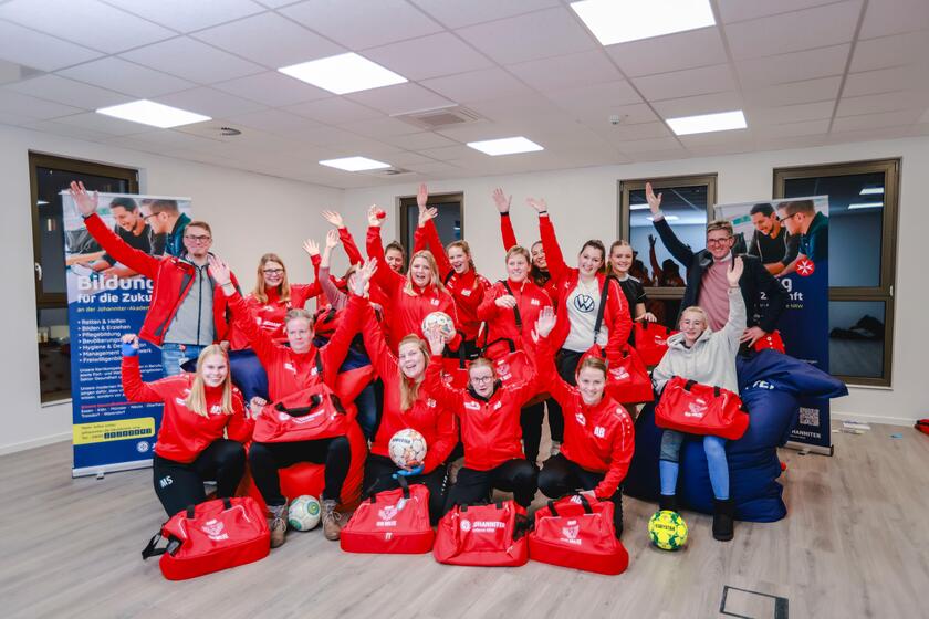 Die Überraschung ist gelungen – gestern wurde die Frauenfußballmannschaft DJK-Milte in den neuen Räumen am Gesundheitscampus der Johanniter in Warendorf von ihren neuen Partnern und Sponsoren empfangen. Die Johanniter Akademie NRW und der Regionalverband Münsterland/Soest unterstützen die Mannschaft mit neuen knallroten Sporttaschen, die mit den passenden Initialen der Spielerinnen schon auf sie warteten.