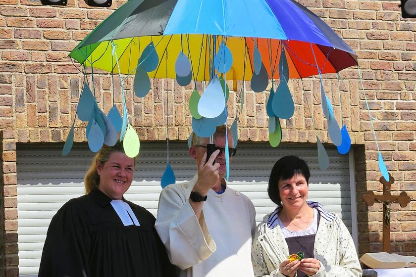 Den Auftakt bildete ein ökumenischer Gottesdienst. Hier wurde der Frage nachgegangen, „Was bedeutet denn eigentlich wasserfest?“ In einer Mitmachaktion, die von der Johanniter-Hochwasserhilfe mitgestaltet wurde, konnten eigene Gedanken dazu auf Wassertropfen aufgeschrieben werden, die hinterher an einem bunten Schirm befestigt wurden.