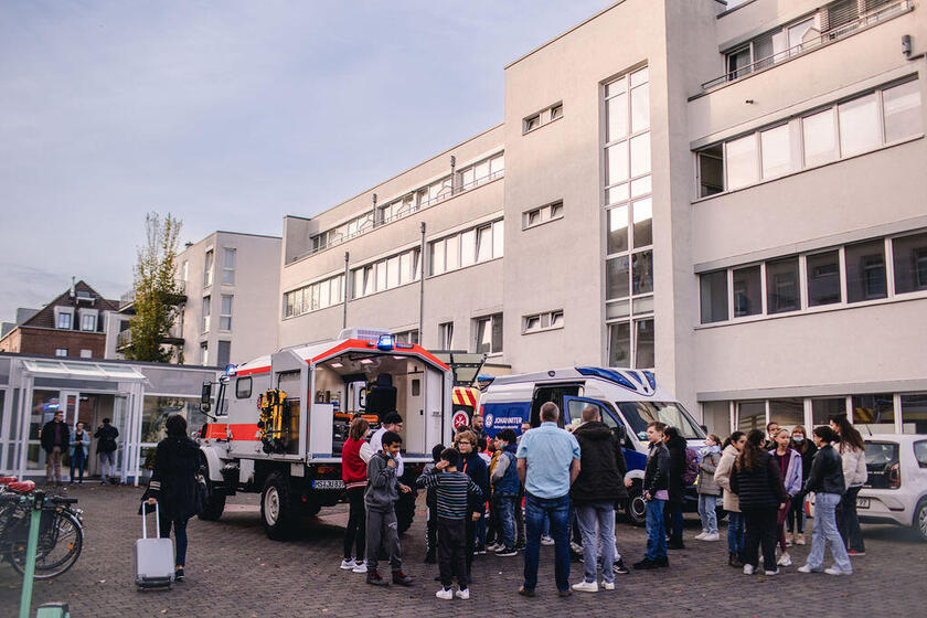 Laut brummend kommt der Johanniter-Unimog mit Blaulicht auf den Innenhof der Johanniter Akademie NRW gefahren und lässt die Augen der 27 Schülerinnen und Schüler aus der 6C groß werden. Der Unimog platziert sich direkt neben dem ausgebauten RTW der Rettungshundestaffel, denn die Fahrzeuge, samt Besatzung, warten auf die neugierigen Schülerinnen und Schüler der Realschule aus dem Kreuzviertel in Münster. Auf sie wartet in der Johanniter-Akademie ein buntes Programm rund um das Thema: retten und helfen.
