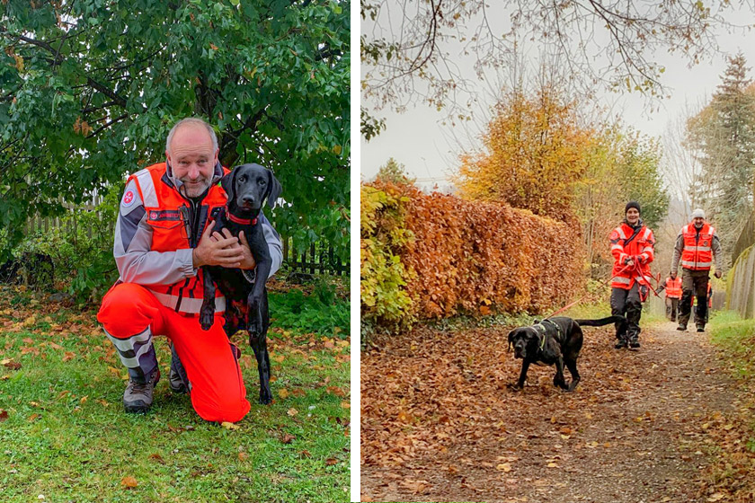Bildunterschrift (1): Andreas Müller, Staffelleiter der Rettungshundestaffel der Johanniter in Peißenberg mit Lenny. Bildnachweis: Irmgard Gruber