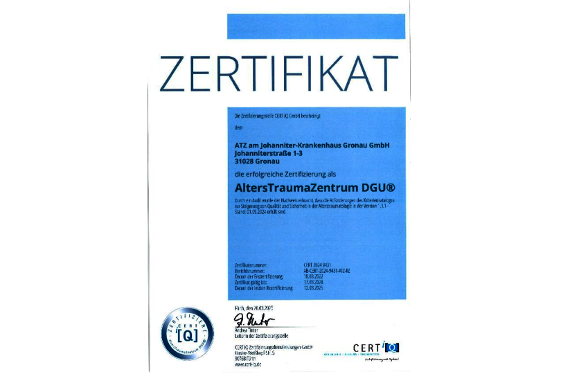 Nach dem Rezertifizierungsverfahren im Februar 2025 haben wir jetzt endlich das neue Zertifikat für unser AltersTraumaZentrum erhalten.