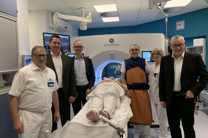 Die neuen Geräte sind nicht nur leistungsstark, sondern auch zukunftssicher. „Sie sind skalierbar und können im Rahmen des technischen Fortschritts weiter aufgerüstet werden. Zudem macht der Einsatz von Künstlicher Intelligenz (KI), dass die Strahlenaustrittsröhre so eingestellt wird, dass optimale Bilder entstehen“, erklärt Marcel Salomon von der Herstellerfirma GE HealthCare. Er nennt die neuen CT „perfekte Maschinen“. Dank der KI entfielen außerdem Arbeitsschritte, die bei den alten Geräten noch zu erledigen waren. „Nun haben unsere Mitarbeiter mehr Zeit direkt am Patienten“, so Dr. Trusen.