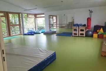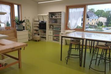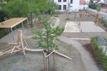 Der Garten als Außenfläche ist groß und weitläufig gestaltet. Neben Wiesenflächen gibt es einen großen Kletterparcour als Eyecatcher. Aber auch Klassiker wie Schaukeln und ein Sandkasten dürfen nicht fehlen. Ein kleiner bepflanzter Hügel rundet das Bild des lebendigen und liebevoll gestalteten Gartens ab. Verschiedene Pflanzkästen und Blumentöpfe verschönern den Blick und die Kinder pflanzen hier Obst, Gemüse oder auch Blumen an. Die Terrasse bietet den Kindern Platz für Tische um dort zu spielen oder gemütlich Brotzeit zu machen.