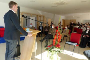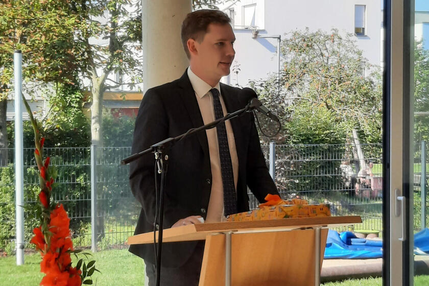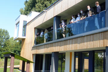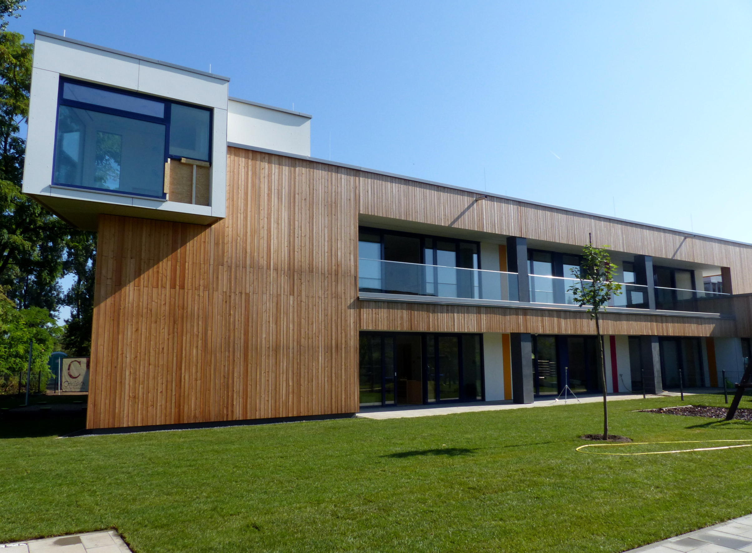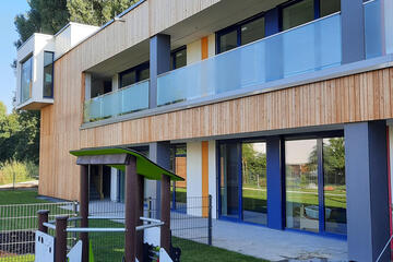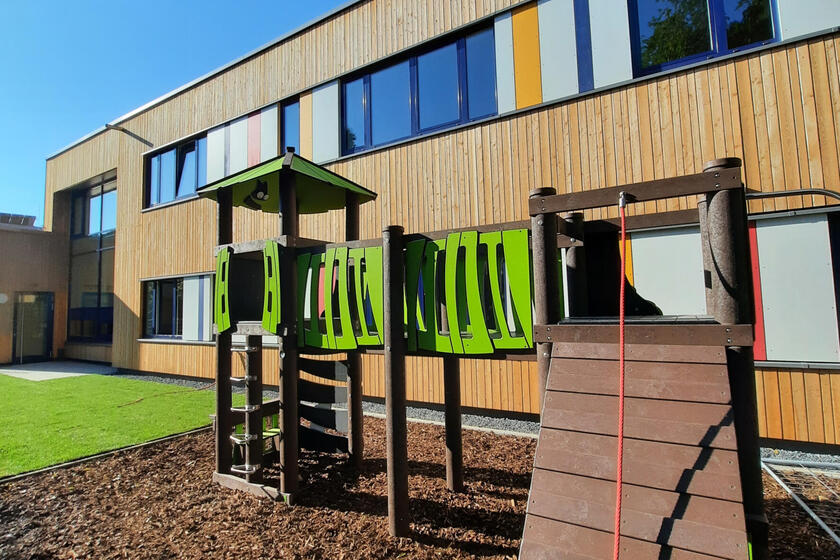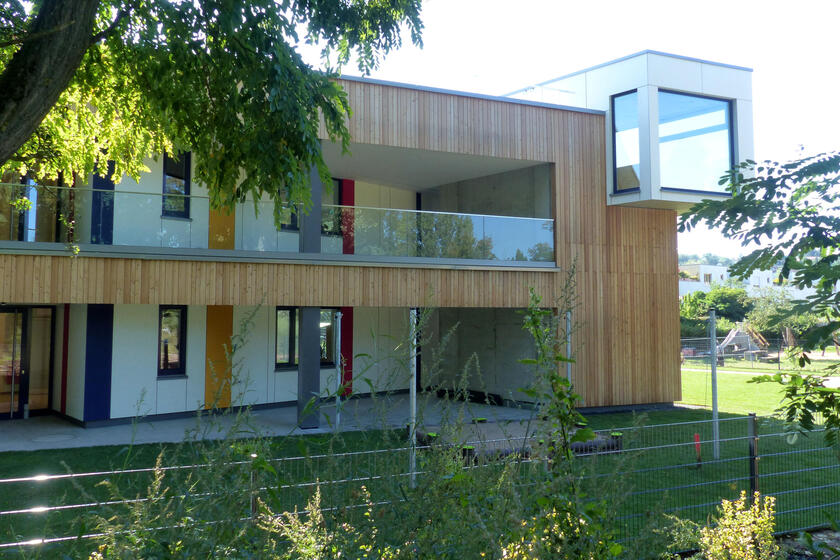 Der zweigeschossige Neubau wurde von Juli 2020 an in Holzbauweise errichtet und wird so höchsten energetischen Anforderungen gerecht. Der ökologische Grundgedanke wurde auch bei der Wahl der weiteren Baumaterialen und beim Innenausbau fortgeführt.