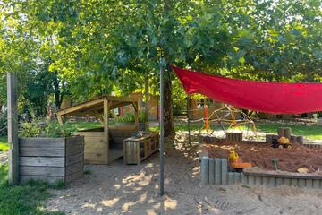 Unser großer Garten bietet den Kindern vielfältige Möglichkeiten zum Spielen: Sie können schaukeln, klettern, im Sand spielen oder Bobby-Car fahren und unser Bauwagen lädt zu wissenschaftlichen Experimenten ein.