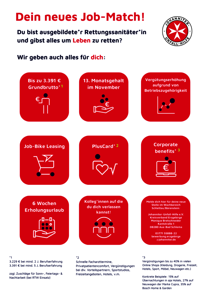 Du bist Rettungssanitäter*in und auf der Suche nach einem Arbeitgeber mit Herz, Struktur und echter Teamarbeit? Dann nutze die Gelegenheit und lerne uns ganz unverbindlich kennen – beim offenen Bewerbernachmittag an unserer Rettungswache in Schlettau.