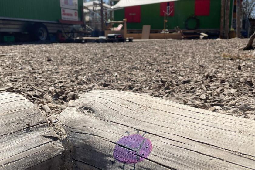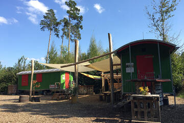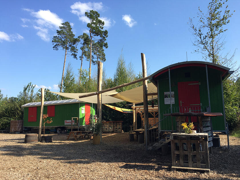 Je ein mit unterschiedlichstem pädagogischen Material ausgestatteter Bauwagen bietet Aufenthaltsmöglichkeiten bei großer Kälte oder sehr starkem Regen.