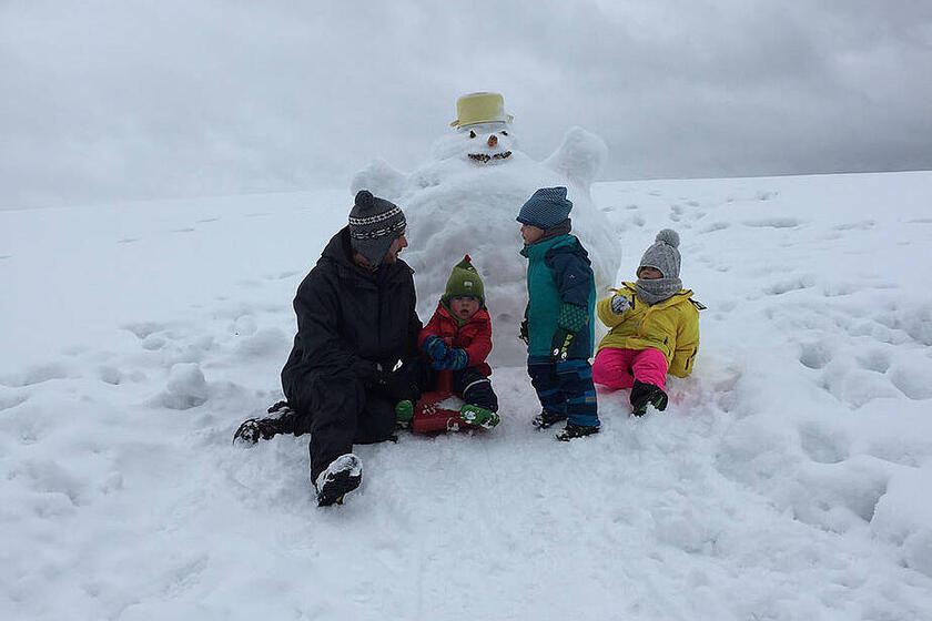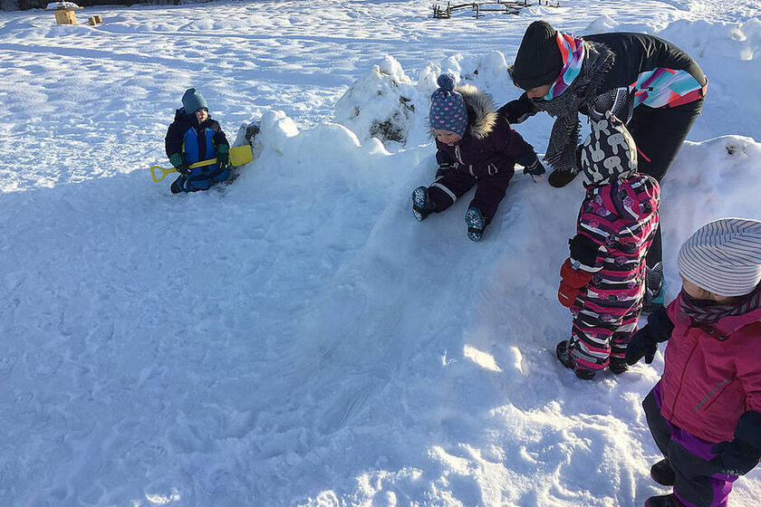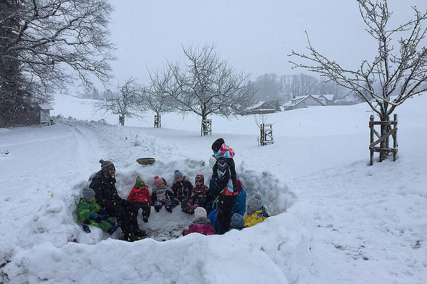 Wir entdecken, wie sich der Rößler Weiher, der Stille Bach und die Natur rings um uns im Winter verändern, bauen Schneemänner und begrüßen uns in unserer selbstgebauten Schneeburg im Morgenkreis.