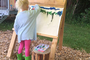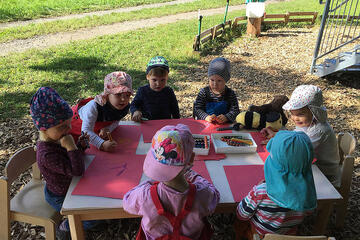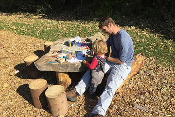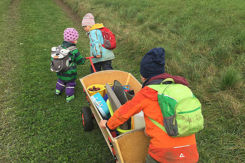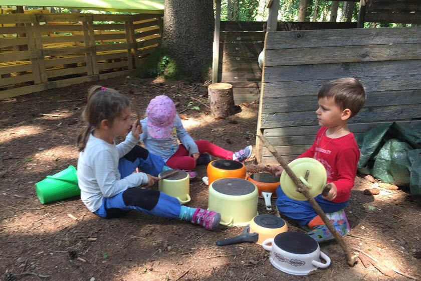 Sie entdecken die Welt durch eigenständiges, aktives Handeln. Aus pädagogischer Sicht geht es auch darum, den Kindern etwas zuzutrauen. Sie dürfen auf dafür ausgewiesene Bäume klettern, sie dürfen "gefährliche" Dinge ausprobieren, wie z.B. sägen mit einer Kindersäge, bohren mit einem Handbohrer. Diese Werkzeuge sind im Waldkindergarten kein Tabu. Durch diese Erfahrungen lernen die Kinder ihre eigenen Grenzen besser kennen und stärken gleichzeitig ihr Selbstbewusstsein. Die Kinder lernen der Natur gegenüber achtsam zu sein und das wertzuschätzen, was sie ihnen bietet. Gespielt wird mit allem, was der Erlebnisraum Wald hergibt: Matsch und Moos, am Boden liegende Baumstämme, Stöcke und Blätter. Es wird gesungen und gelacht, geklettert und geschaukelt, gelesen und gemalt. Bei jedem Wetter finden die verschiedensten Angebote statt. Ein liebevoll eingerichteter Bauwagen bietet Unterschlupf bei Kälte oder sehr starkem Regen.