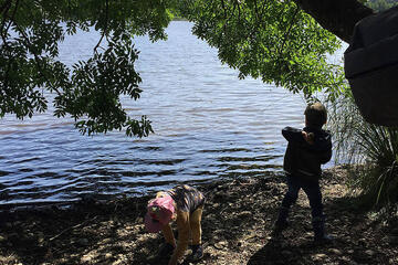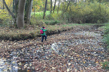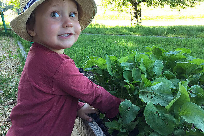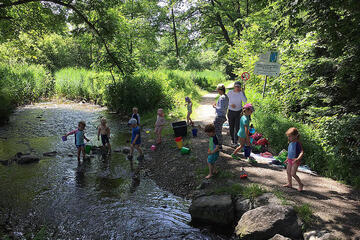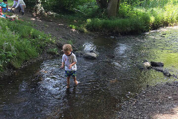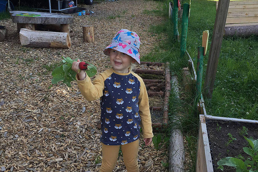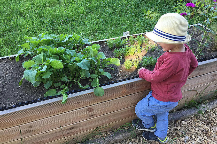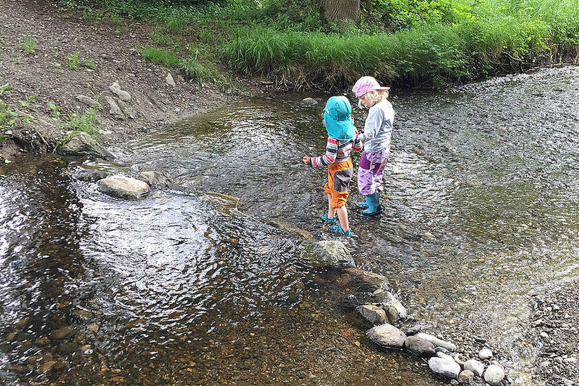 Das ist gut so, denn nun wächst unser Gemüse im Hochbeet und wir können schon die ersten Radieschen und Karotten ernten. Wenn es uns zu warm wird, spielen wir in unserem Wald, da ist es schattig und kühl. An sehr heißen Tagen spazieren wir zum nahen Bach, ziehen unsere Schuhe und Socken aus und plantschen im kühlen Wasser. Hier gibt es außerdem einiges zu entdecken und zu erleben: Wir können einen Staudamm bauen, unsere selbstgebauten Boote schwimmen lassen oder mit Astangeln allerhand einfangen, was im Bach treibt.