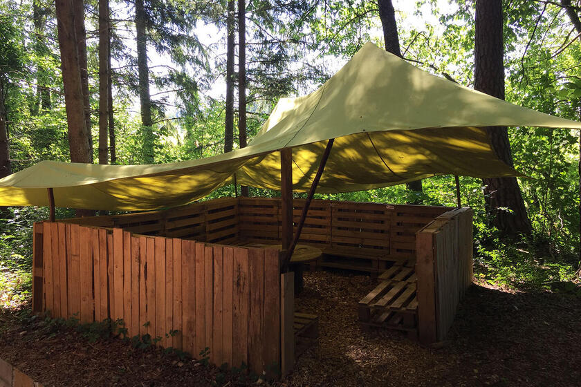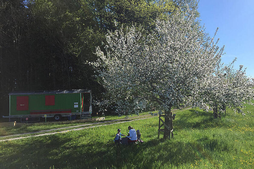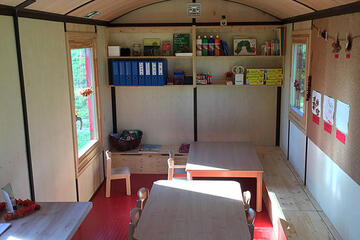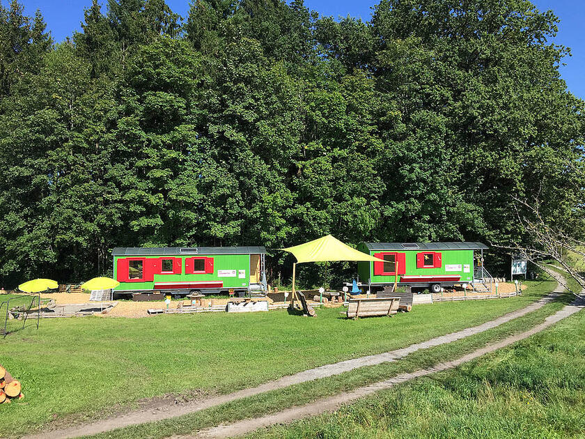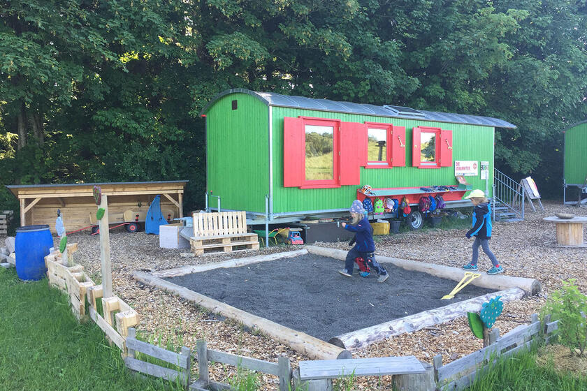 Je ein altersgerecht ausgestatteter Bauwagen bietet Aufenthaltsmöglichkeiten bei Kälte oder sehr starkem Regen.