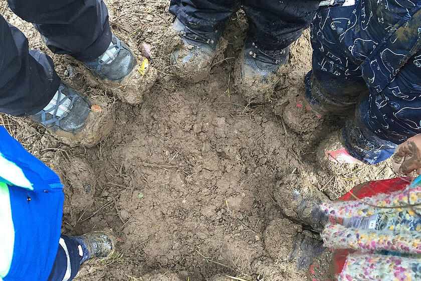 Auch über die Regentage im Frühling freuen wir uns; es gibt schließlich Regenjacken, Regenhosen, Gummistiefel und jede Menge tolle Pfützen! Außerdem beobachten wir die Regenwürmer, wie sie bei Regen aus der Erde kommen. Falls es uns doch mal zu nass wird, können wir in unserem Wald unter seinem dicken Laubdach Schutz suchen.