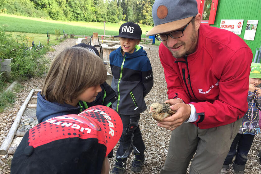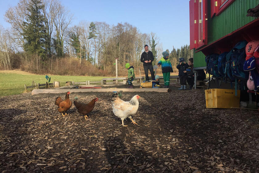 Seit September 2020 gibt es bei uns in der Waldkita ein laufendes Hühnerprojekt. Gestartet haben wir mit drei kleinen Küken, die wir bei uns großgezogen haben. Die Kinder lernen somit den Kreislauf vom Ei zum Küken, zum Huhn und zurück zum Ei, kennen. Sie übernehmen Verantwortung bei der Versorgung der Tiere und lernen den respektvollen Umgang mit ihnen und den daraus entstehenden Lebensmitteln.