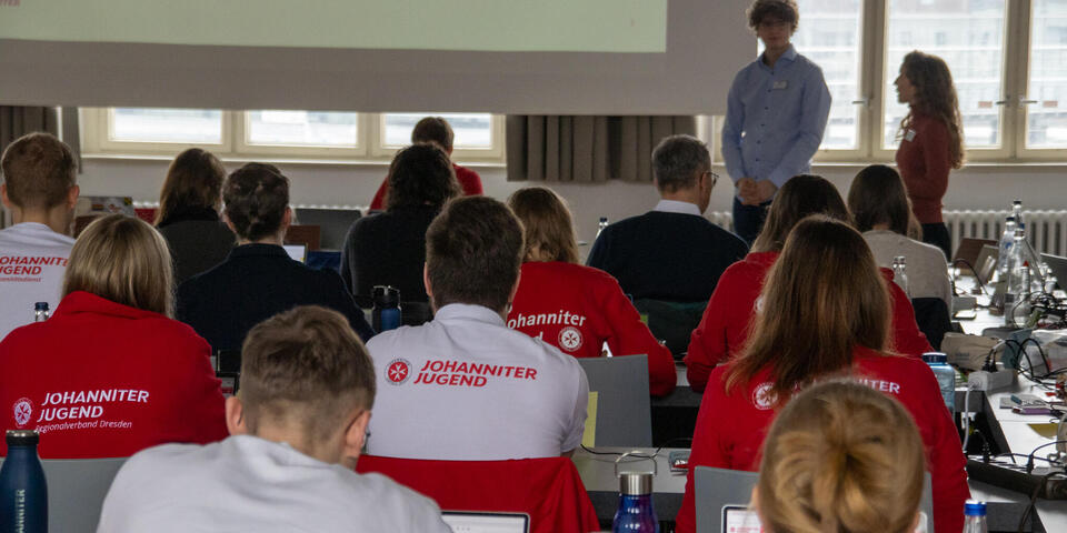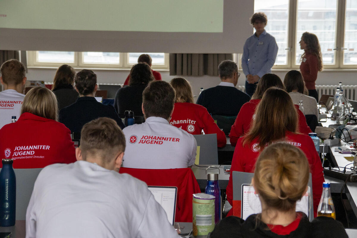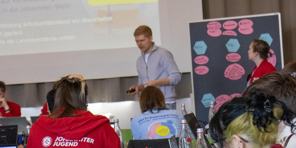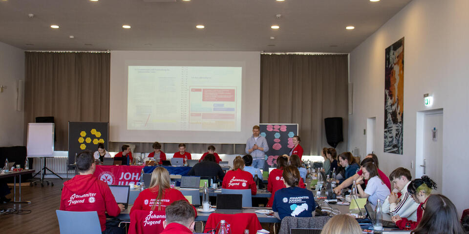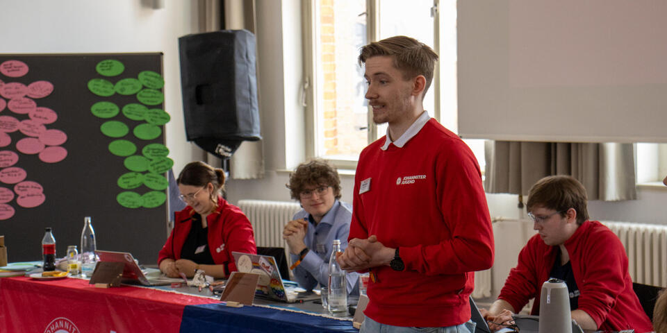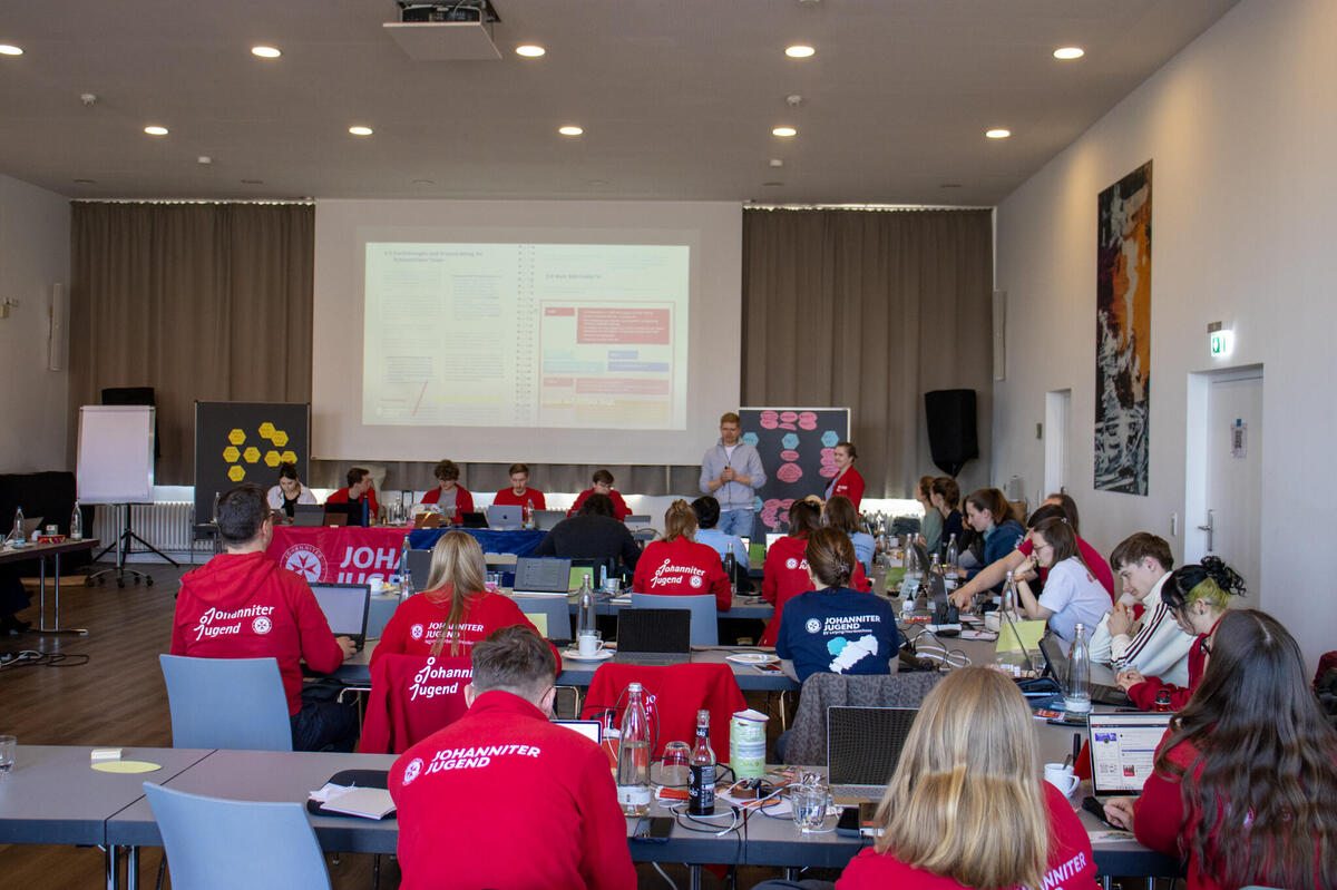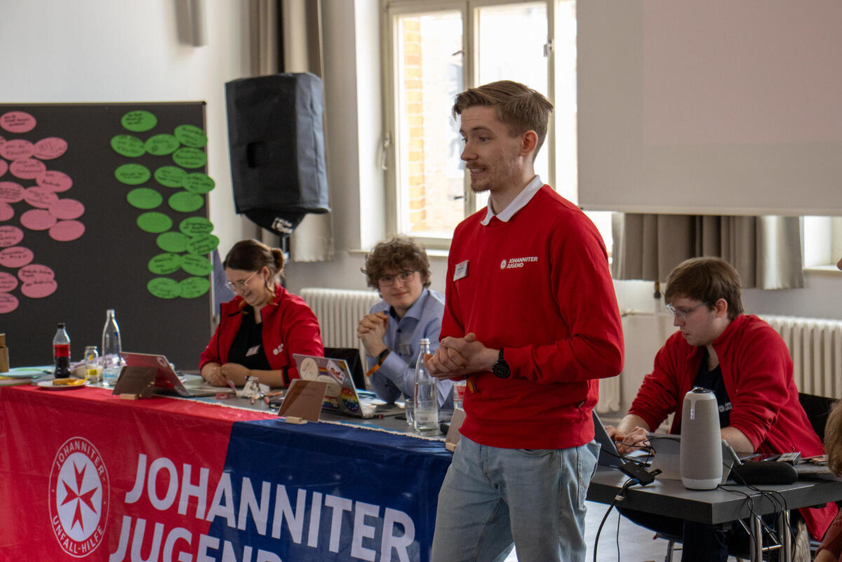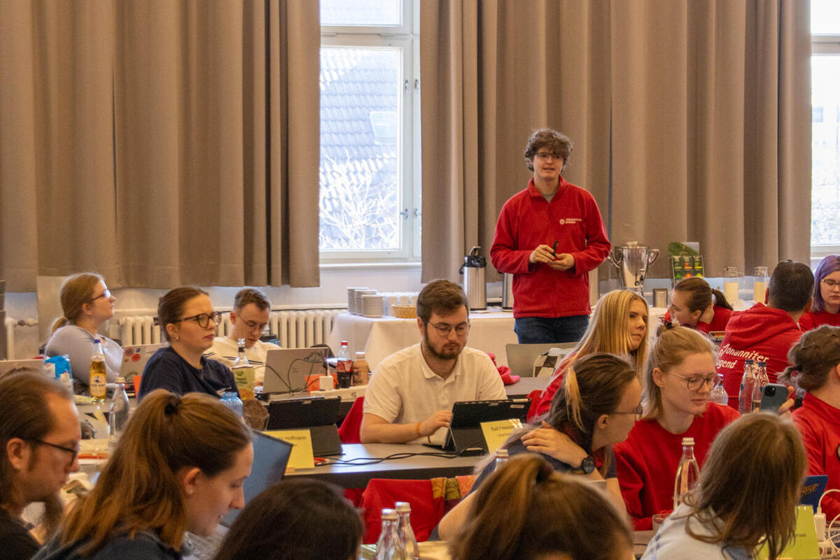 Am Samstag eröffnete Bundesjugendleiter Noah die Versammlung. Zum Start der Versammlung waren als Gäste Oliver Meermann, Mitglied des Bundesvorstandes der Johanniter-Unfall-Hilfe e.V., und David Kreuziger, Mitglied des Landesvorstandes Berlin/Brandenburg der “JUH” mit vor Ort. Oliver Meermann stellte sich kurz vor und betonte: "Ich freue mich auf die Zusammenarbeit mit der JJ. Ich arbeite gerne mit jungen Menschen zusammen - das erfrischt den Geist!" Ebenso gab er Einblicke und Hintergründe in das Thema der Zivilen Verteidigung, mit dem sich die Bundesjugendversammlung später noch befasste. David Kreuziger appelierte, wie wichtig es ist im Dialog zu bleiben und Kritik auszuhalten. Sowohl gesellschaftlich als auch im Verband. "In der Johanniter-Jugend sehe ich einen selbstbewussten und starken Teil unseres Verbands. Ihr seid ein ganz praktisches, tolles Angebot für junge Menschen mit gelebter Demokratie, Verantwortung und Prävention", lobte er.