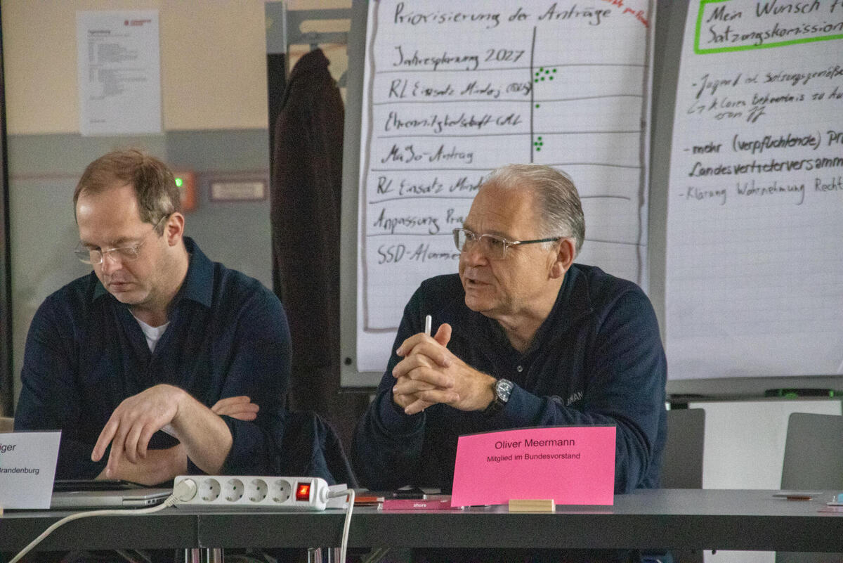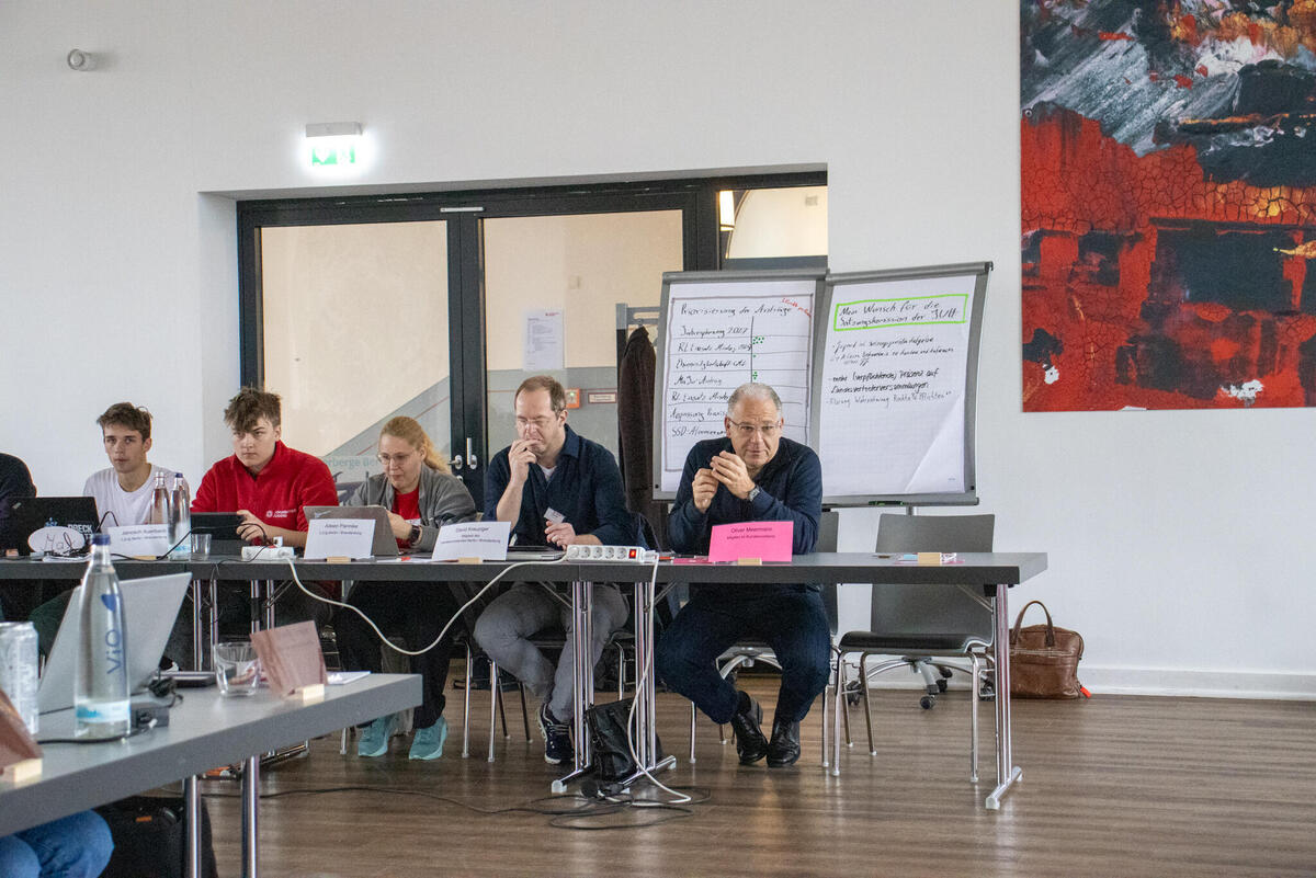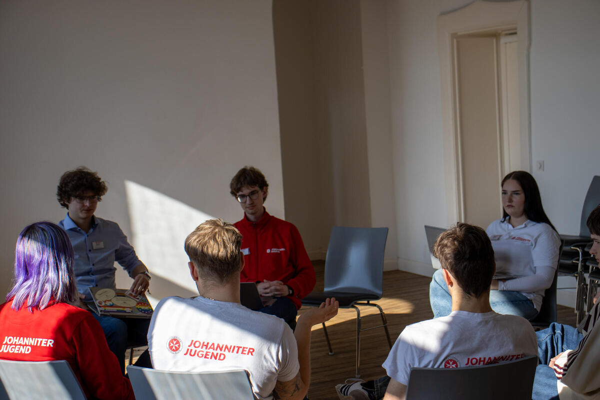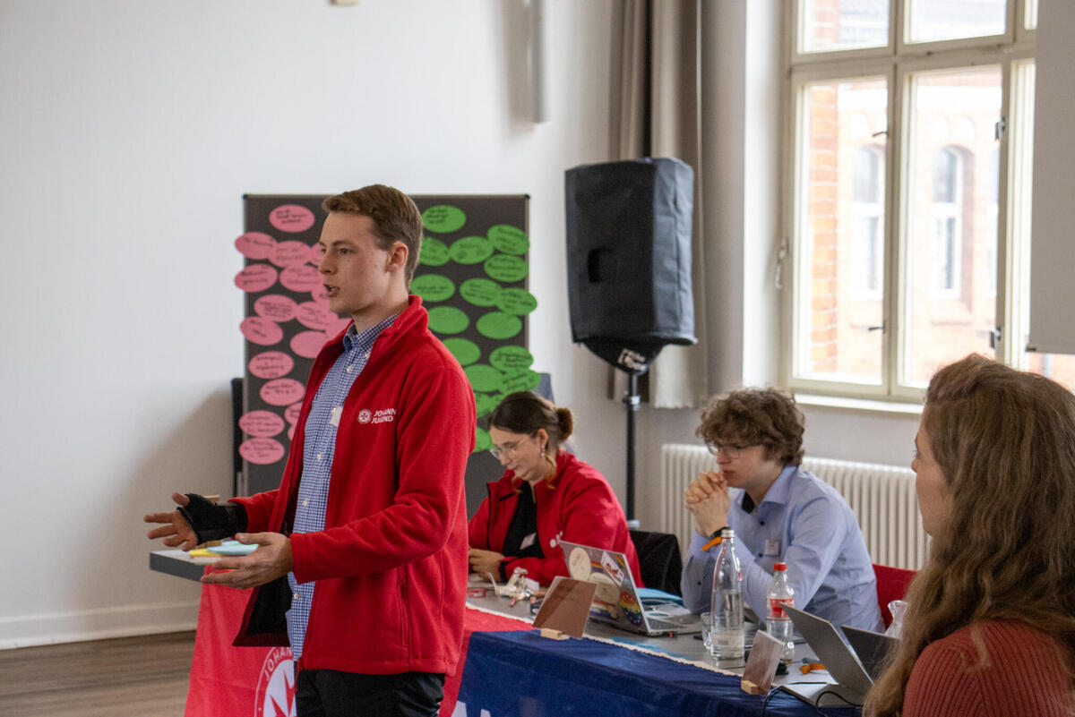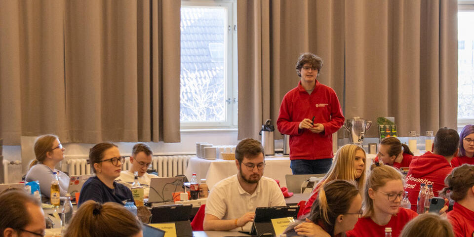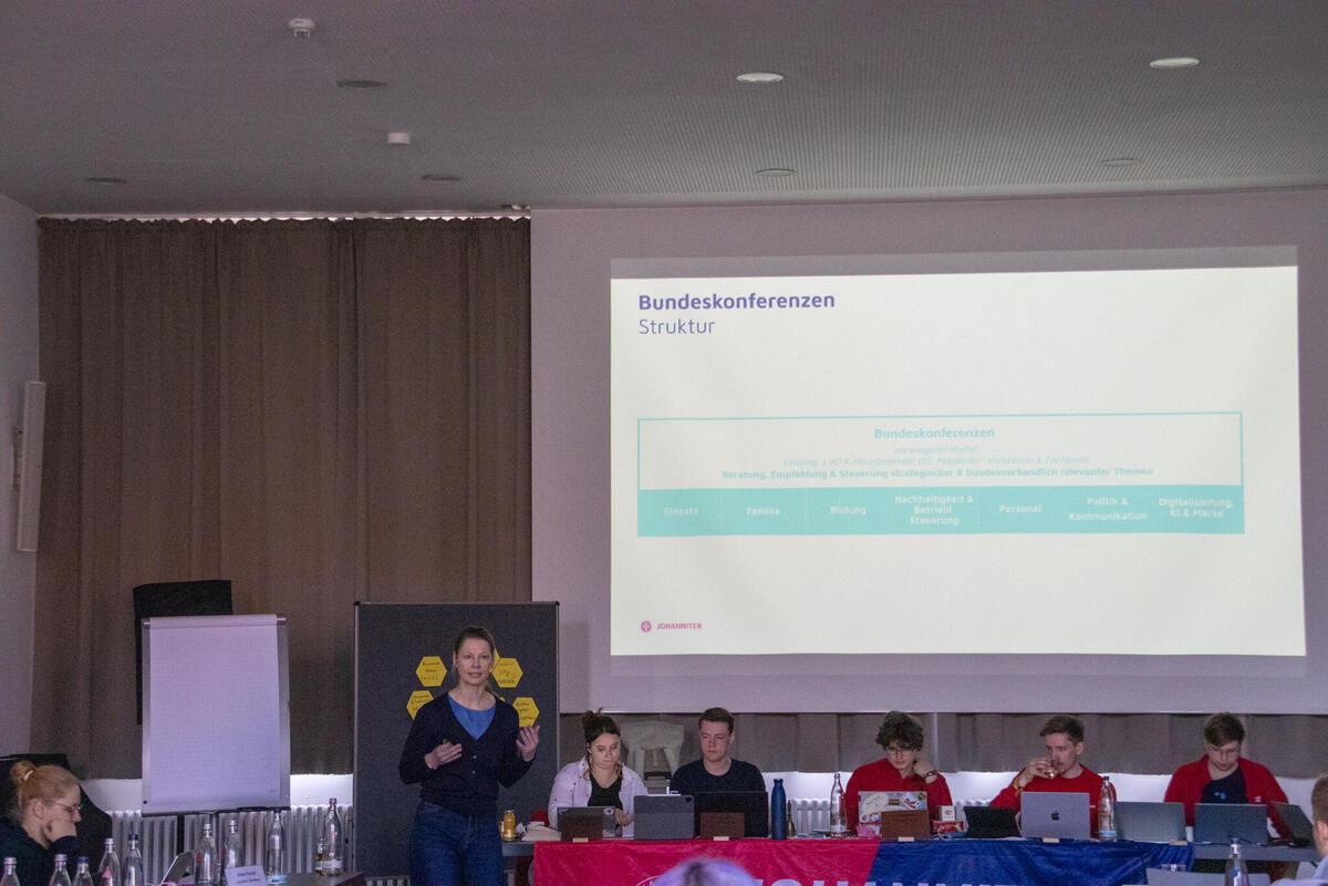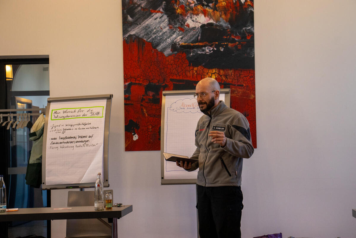 Am Samstag eröffnete Bundesjugendleiter Noah die Versammlung. Zum Start der Versammlung waren als Gäste Oliver Meermann, Mitglied des Bundesvorstandes der Johanniter-Unfall-Hilfe e.V., und David Kreuziger, Mitglied des Landesvorstandes Berlin/Brandenburg der “JUH” mit vor Ort. Oliver Meermann stellte sich kurz vor und betonte: "Ich freue mich auf die Zusammenarbeit mit der JJ. Ich arbeite gerne mit jungen Menschen zusammen - das erfrischt den Geist!" Ebenso gab er Einblicke und Hintergründe in das Thema der Zivilen Verteidigung, mit dem sich die Bundesjugendversammlung später noch befasste. David Kreuziger appelierte, wie wichtig es ist im Dialog zu bleiben und Kritik auszuhalten. Sowohl gesellschaftlich als auch im Verband. "In der Johanniter-Jugend sehe ich einen selbstbewussten und starken Teil unseres Verbands. Ihr seid ein ganz praktisches, tolles Angebot für junge Menschen mit gelebter Demokratie, Verantwortung und Prävention", lobte er.