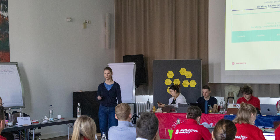 Dann richtete Anna Appelt, Mitglied des Präsidiums, ein paar Worte an die Versammlung. Gemeinsam mit Hans-Martin Grusnick, der sich im Verlauf der Versammlung auch digital zuschaltete, übernimmt sie die Aufgabe als Beauftragte im Präsidium für die Johanniter-Jugend.