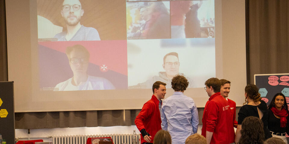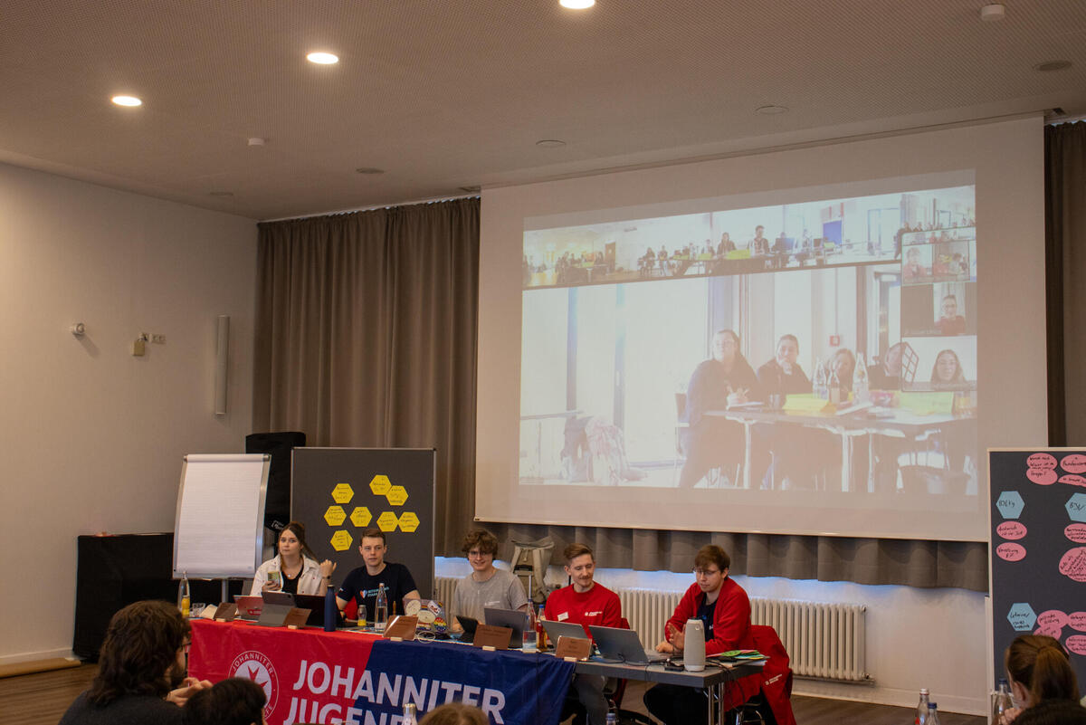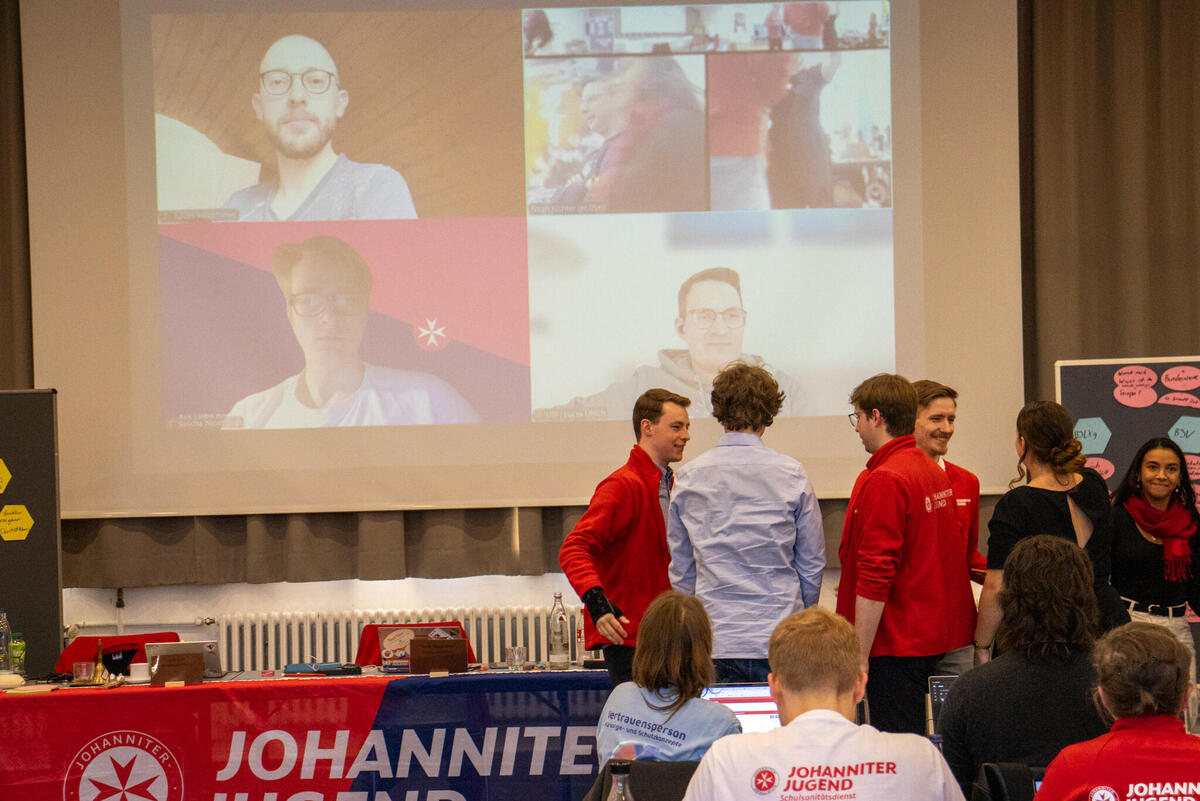 Der Sonntagmorgen startete mit einer Andacht von dem Landespfarrer Berlin/Brandenburg, Christopfer Schuller. Er betonte den christlichen Auftrag anderen Menschen zu helfen, der auch Kern der Tätigkeit der Johanniter-Jugend ist. Danach startete die Versammlung mit einer hybride Zuschaltung. Parallel tagte die Bundesjugendversammlung der Malteser Jugend in Köln. Gemeinsam wurde ein Freundschaftsbeschluss zwischen Malteser Jugend und Johanniter-Jugend beschlossen. Hintergrund ist die bereits sehr enge Kooperation beider Jugendverbände unterm Achtspitzigen Kreuz und der Wille beider Leitungen diese Freundschaft stärker auszubauen. Anschließend ging es weiter in die weitere Beschlussfassung der anderen Anträge