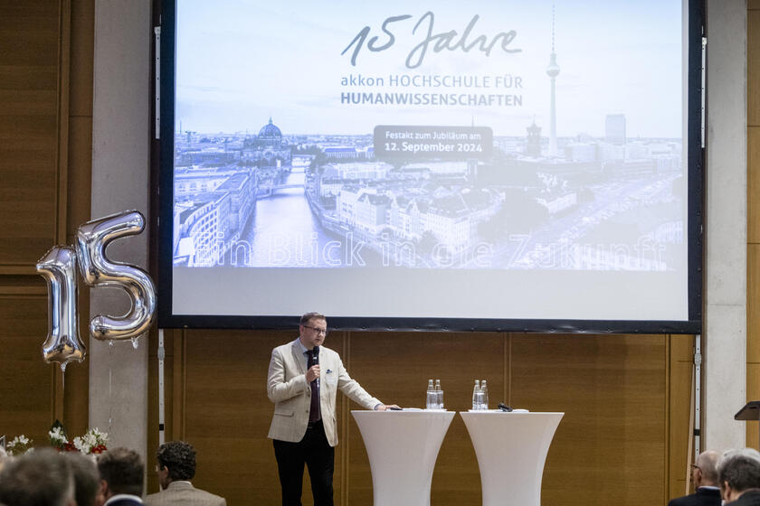 Beim Festakt im Aquino Tagungszentrum in Berlin betonte Prof. Dr. Andreas Bock, Präsident der Akkon Hochschule: „Die Erfolgsgeschichte der Hochschule beweist eindrucksvoll, wie groß der Bedarf an praxisorientierter Lehre und Forschung war und ist. Vor 15 Jahren hat die Akkon Hochschule ihren Lehrbetrieb aufgenommen, um Studierende auf ihre berufliche Zukunft vorzubereiten. Dieses Konzept ist bis heute prägend und hat zahlreiche erfolgreiche Alumni hervorgebracht."