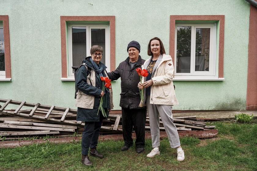 In der Ukraine besuchte Susanne Wesemann (links) zusammen mit Olena Tanasiichuk (rechts), Projektleiterin von ELEOS, vom Konflikt betroffene Menschen in Butcha, nördlich von Kyjiw.