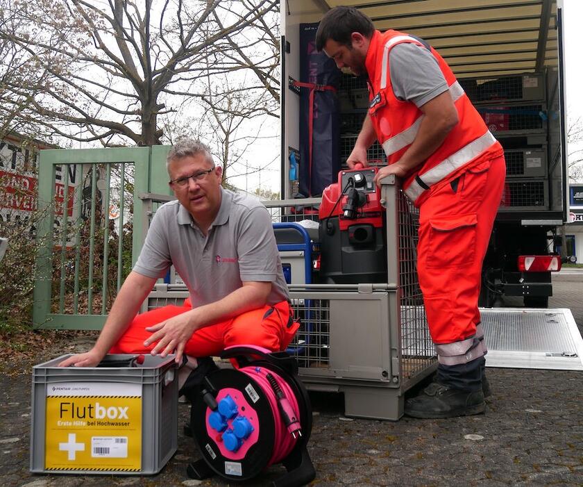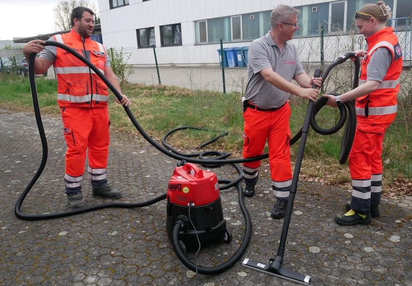 Besen, Schaufeln, Eimer und Müllsäcke sind auch vorhanden, ebenso Akkulampen und Kanister für zusätzlichen Treibstoff. „Keep it simple“, erklärt Sven Müller das Motto. Weil im Notfall der Stress ohnehin schon groß ist, soll alles möglichst selbsterklärend sein. Für eine geordnete Aus- und Rückgabe ist alles Wichtige mit Barcodes versehen. Müller ist überzeugt, dass das funktioniert: Die 100 Bautrockner, die die JUH vergangenes Jahr verliehen hat, seien auch „in einem ordentlichen Zustand” zurückgekommen.