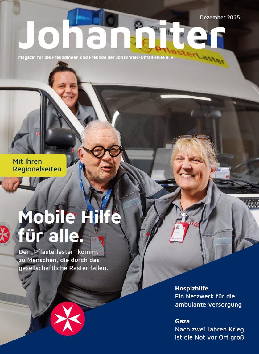 In der 32-seitigen Publikation informieren wir mit spannenden Reportagen und Berichten über Hilfsprojekte der Johanniter in Deutschland und über die Arbeit der Johanniter-Auslandshilfe in Krisengebieten weltweit. Außerdem bieten wir wertvolle Informationen zu den Dienstleistungen der Johanniter sowie Service-Beiträge rund um die Themen Gesundheit und Sicherheit. Porträts von Ehrenamtlichen, kurze Einblicke in ganz besondere Projekte und ein Preisrätsel runden das Themenspektrum ab.