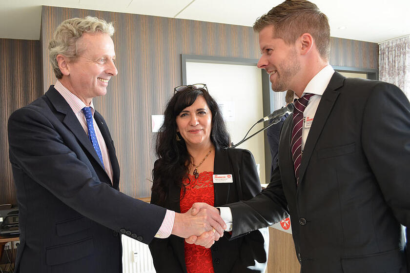 Der Herrenmeister des Johanniterordens, S.K.H. Dr. Oskar Prinz v. Preußen (l.), wünscht Einrichtungsleiter Luis Rulle und Pflegedienstleiterin Milenia Flores de Mahnecke alles Gute für ihre Führungsarbeit in der neuen Senioreneinrichtung. Foto: Regina Villavicencio