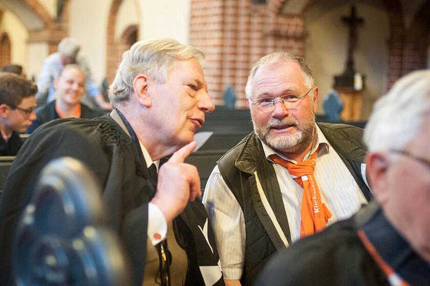 Am Freitagabend fand in der Golgatha-Kirche das Feierabendmahl der Johanniter unter der Leitung von Ordensdekan Prof. Dr. Dr. h.c. mult. Christoph Markschies statt. In seiner Predigt sagte er „Der Gottesberg Sinai liegt in Berlin.“ und nahm Bezug auf das 2. Buch Mose 24. Kapitel Vers 9-11; dort steigt Mose auf den Berg Sinai auf dem Weg zu Gott, ihn zu finden und von ihm gesehen zu werden. Heute ist der Sinai durch Terror und Krieg nicht mehr zu erreichen, doch noch immer kann man sich Gott nahe fühlen. Insbesondere die Johanniter-Familie – so der Ordensdekan – weiß, wie sie Gott finden kann. In der Gemeinschaft, in der Hilfe für Kranke, Geflüchtete und andere Notleidende und im gemeinsamen Glauben. Auch der Johanniterorden, vertreten durch den regierenden Kommendator der Brandenburgische Provinzial-Genossenschaft, Dr. Nikolaus Würtz, und 24 weitere Ordensmänner, nahm an dem offenen Gottesdienst zum Kirchentag teil. Sie kamen mit anderen Besuchern ins Gespräch, als der Ordensdekan gleich zu Anfang dazu aufrief, sich gegenseitig kennenzulernen und „einmal im Gottesdienst mit dem Nachbarn ein Schwätzchen zu halten“. Denn Kirchentag heißt: Verschiedenste Menschen aus aller Welt sind gemeinsam auf dem Weg - wenn sie einander begegnen und sich kennenlernen, können sie Gott finden.