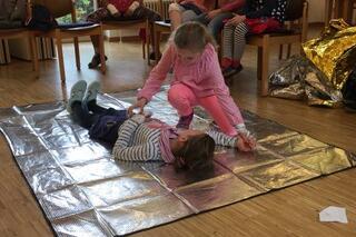 Das absolute Highlight war der Rettungswagen, der von innen und außen begutachtet werden konnte. Einige der Kinder hatten den Wagen schon vorher im Dorf entdecken können und waren gespannt ihn nun wirklich hier vor Ort zu haben. Gleich wurden einige Geschichten erzählt, die sie bereits mit Krankenwagen erlebt hatten. Im Anschluss ging es im Saal weiter. Hier wurden grundlegende Maßnahmen der ersten Hilfe, wie etwa der Notruf, die stabile Seitenlage, die Wundversorgung und auch, dass bereits Trösten erste Hilfe ist, erlernt. Praktische Übungen wie das Ausprobieren, wie es sich anfühlt begafft zu werden oder einen erwachsenen Mann, der doppelt so schwer ist wie man selbst, in die Seitenlage zu bekommen, amüsierten die Kinder und machten den Kurs spannend.
