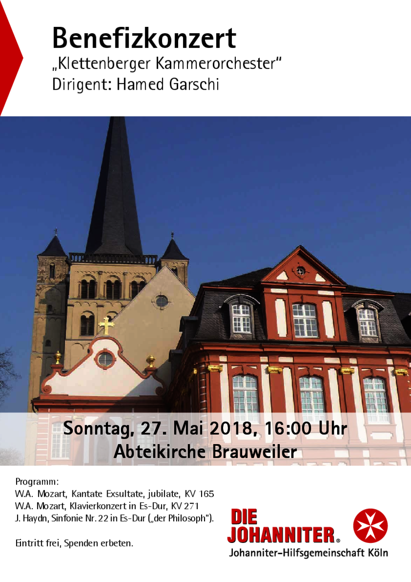 Nach dem Benefizkonzert mit über 250 Besuchern in der Abteikirche zu Brauweiler, getragen von dem wunderbaren Klettenberger Kammerorchester, dirigiert von Hamed Garschi, mit den großartigen Solisten Nami Farahband (Flügel) und Katharina Borsch (Sopran), bedanken wir uns zuerst bei den Musikern, dann aber auch bei allen, die zum Gelingen dieses Tages beigetragen haben.