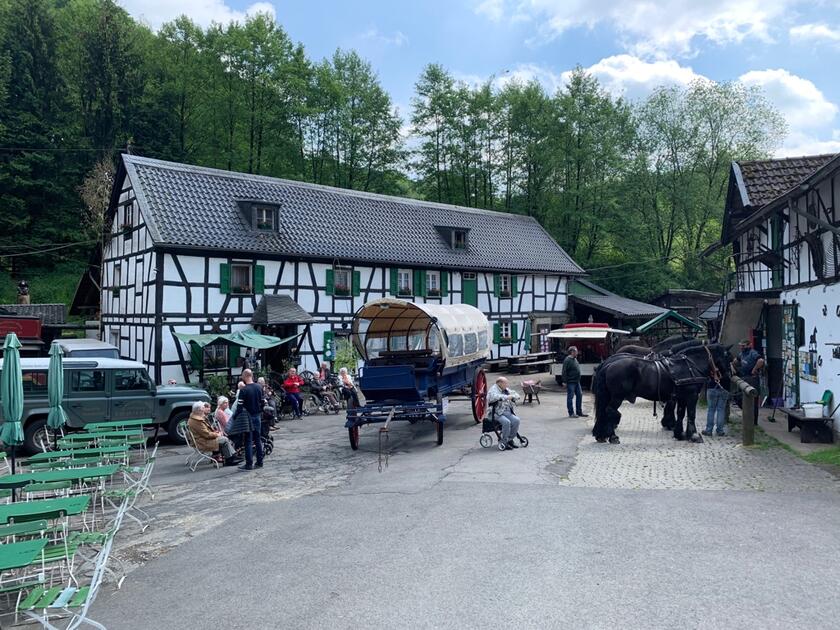 Zwei Busse brachten Bewohner aus den beiden Wohnbereichen des Johanniter-Stift Köln-Kalk ins Bergische Land zum malerischen Hof der Gammersbacher Mühle.