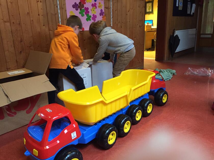 Da man den Kindern eine Überraschung angekündigt hatte, stieg die Spannung natürlich. Schließlich durften die Kinder die verhüllten Pappkartons mit den Spielsachen auspacken. Alles wurde sogleich zusammengebaut und die Fahrzeuge mit den mitgelieferten Folien beklebt. Der nächste Tag im Außenbereich kann kommen, damit die neuen Spielsachen in Einsatz kommen können.